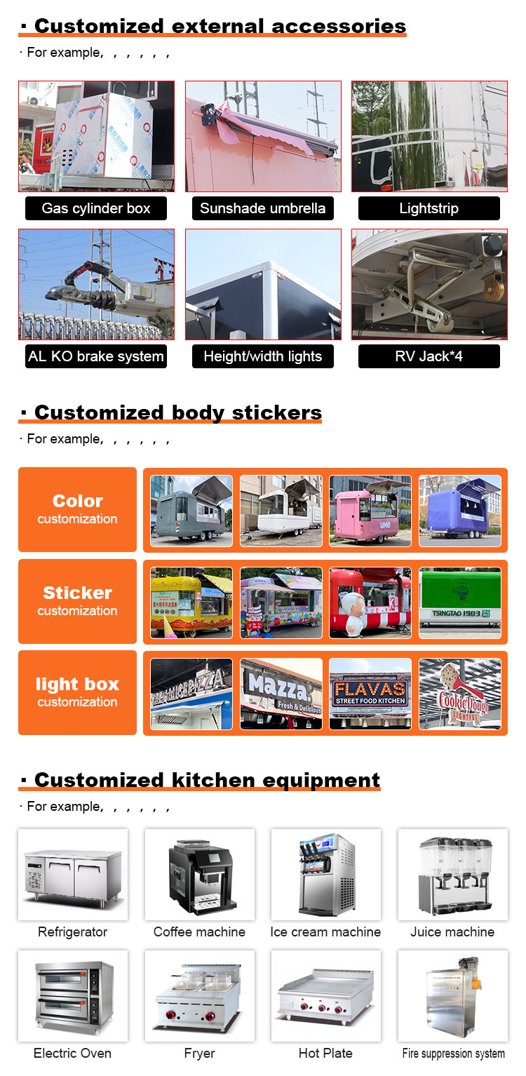 Trailer phục vụ ăn uống di động Thức ăn đường phố Xe xúc xích được trang bị đầy đủ Trailer thực phẩm Xe tải thực phẩm