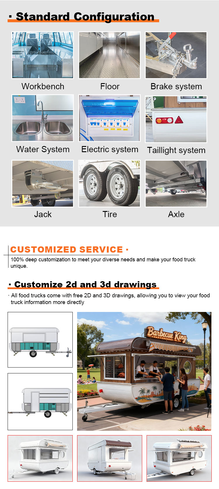 Trailer thực phẩm Xe tải thực phẩm có thể lái được Nhà bếp di động Phục vụ thức ăn đường phố Trailer Khái niệm xe tải thực phẩm Tính năng