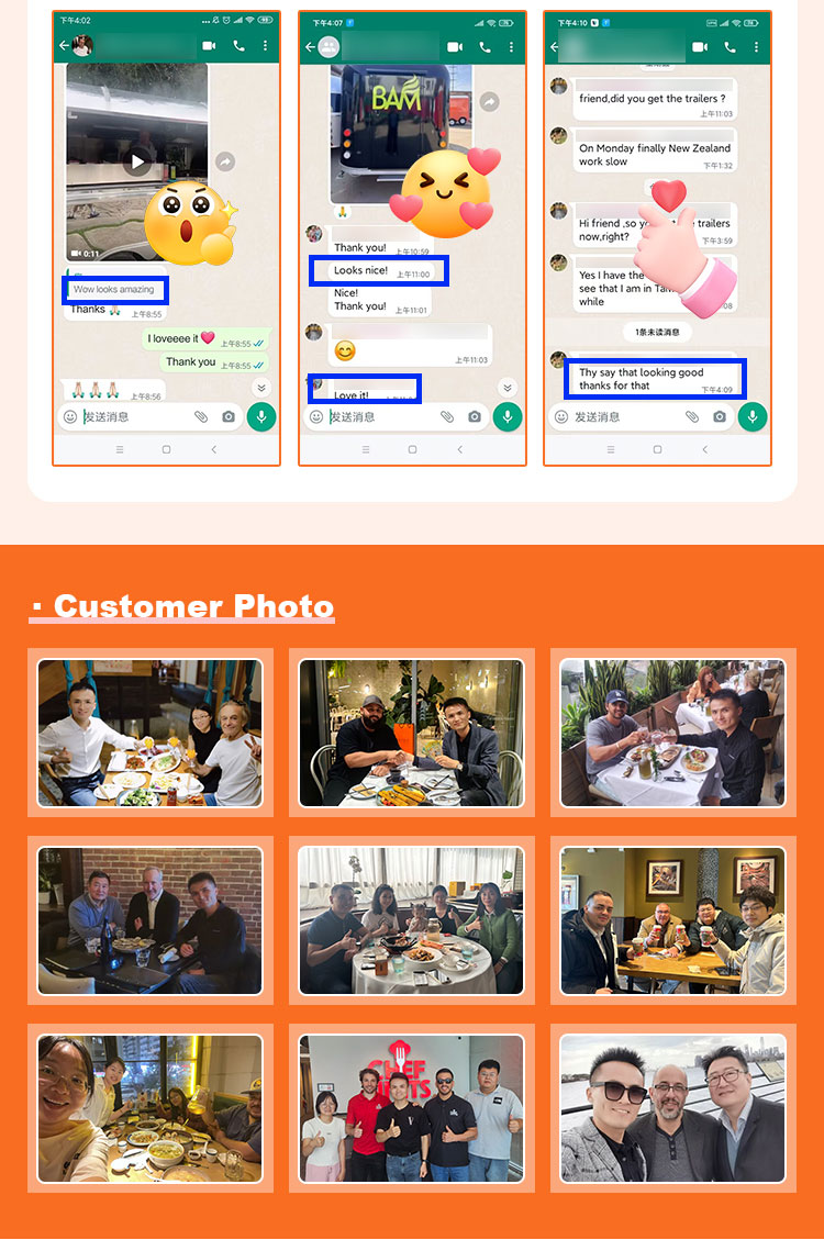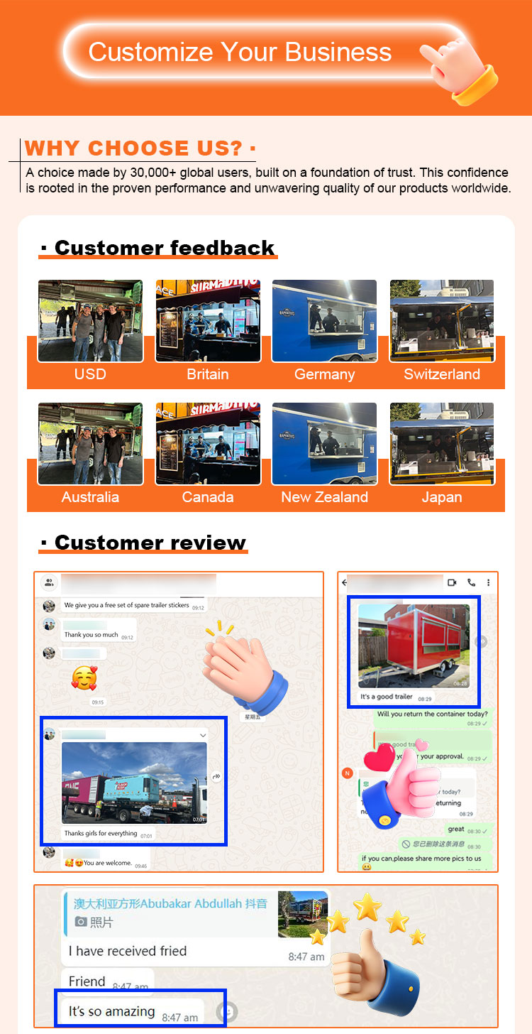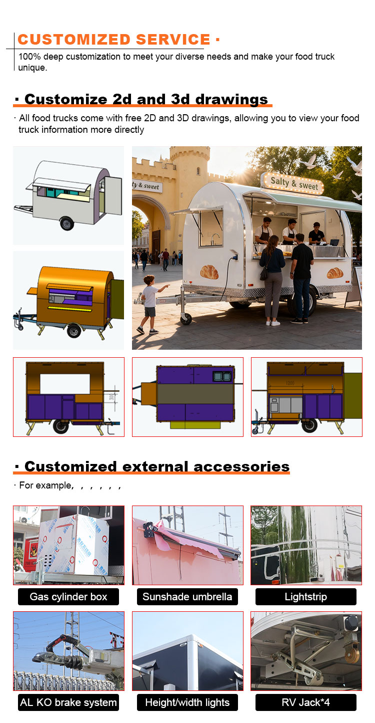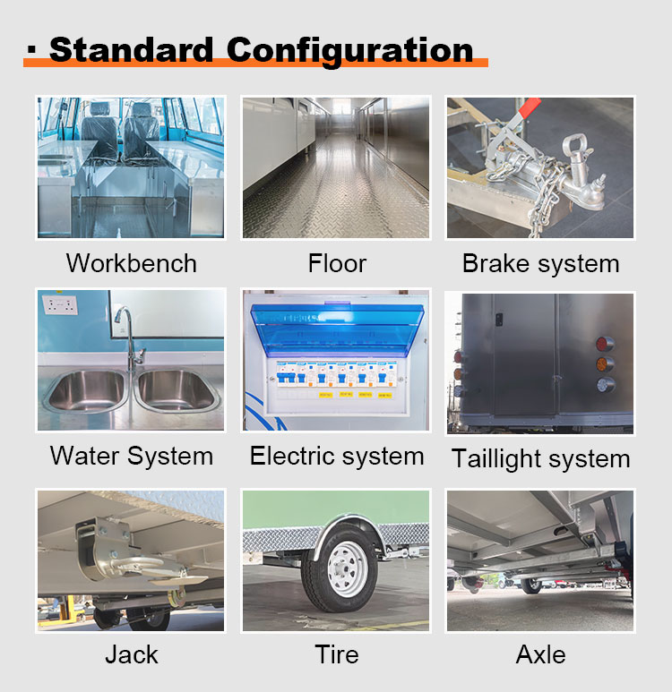 Về chất liệu của các phụ kiện, chúng tôi cũng chú trọng lựa chọn chất lượng cao, bao gồm tay cầm, bản lề và bánh xe bằng thép không gỉ cũng như các bộ phận quan trọng khác, tất cả đều được làm bằng vật liệu chất lượng cao. Thiết kế này không chỉ đảm bảo tính nhất quán và tính thẩm mỹ tổng thể của Food Van mà còn nâng cao hơn nữa độ bền và độ tin cậy của nó. Hiệu suất tuyệt vời của các phụ kiện giúp Food Van hoạt động ổn định và mượt mà hơn trong quá trình sử dụng, đồng thời giảm chi phí bảo trì và thay thế do hư hỏng phụ kiện, mang đến cho người dùng trải nghiệm sử dụng thoải mái và tiết kiệm hơn.