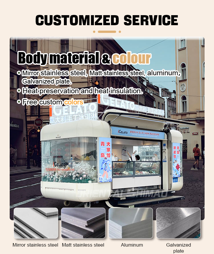 Thép không gỉ vàng: bên ngoài xe bán đồ ăn được làm bằng thép không gỉ vàng cao cấp. Vật liệu này không chỉ có khả năng chống ăn mòn và mài mòn tuyệt vời mà vẻ ngoài màu vàng còn làm tăng vẻ đẹp thị giác và cảm giác cao cấp, giúp xe bán đồ ăn có thể nổi bật trong nhiều môi trường khác nhau.