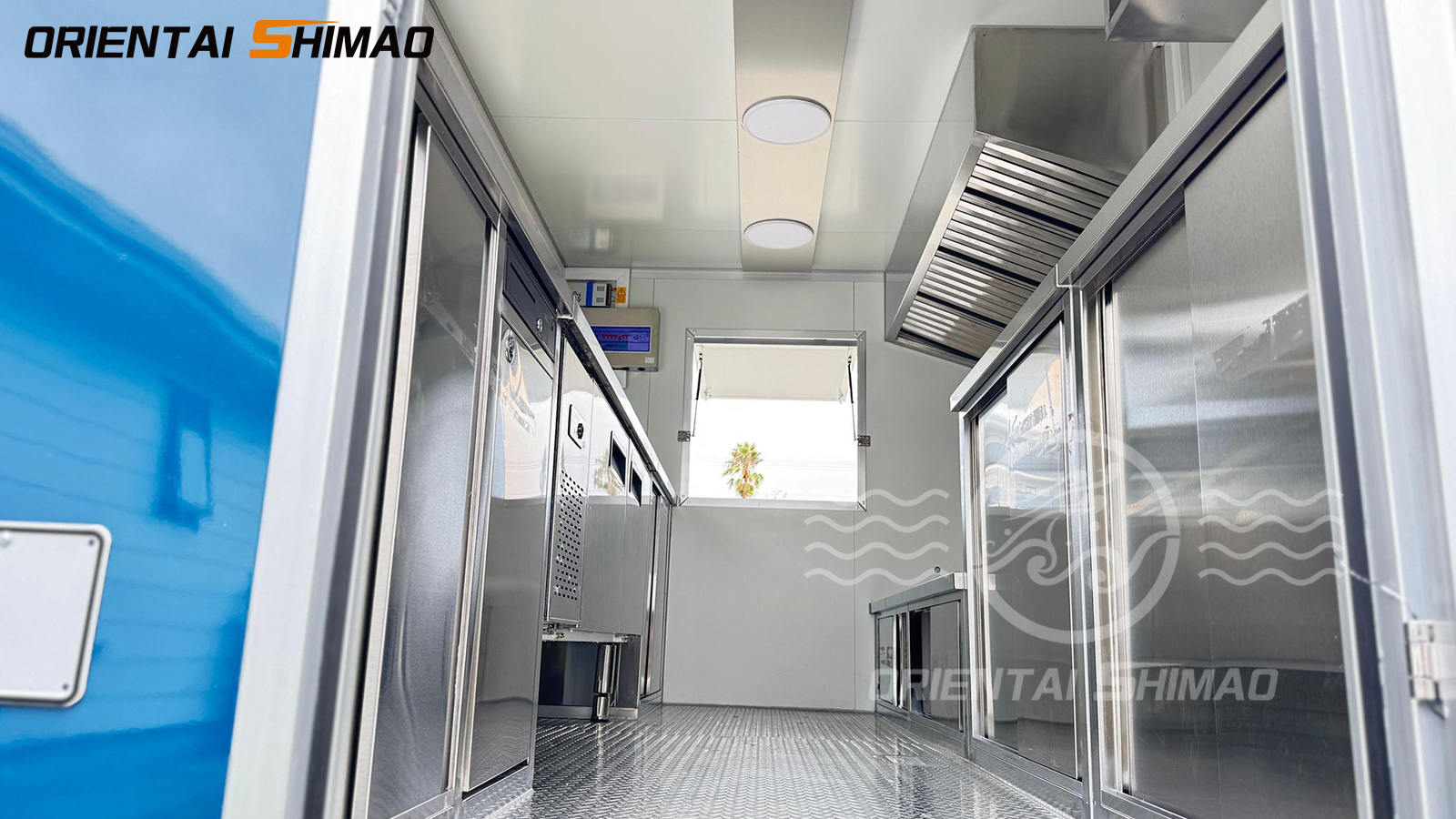 Được trang bị hệ thống nước và điện toàn diện, chiếc xe tải thực phẩm này cung cấp trải nghiệm người dùng tuyệt vời. Cả không gian làm việc và tủ đều được chế tạo từ thép không gỉ mạnh mẽ 304, đảm bảo độ bền và dễ làm sạch trong khi chống lại rỉ sét. Ngoài ra, một tủ lạnh được lắp đặt bên dưới bàn làm việc để ngăn chặn sự hư hỏng thực phẩm.