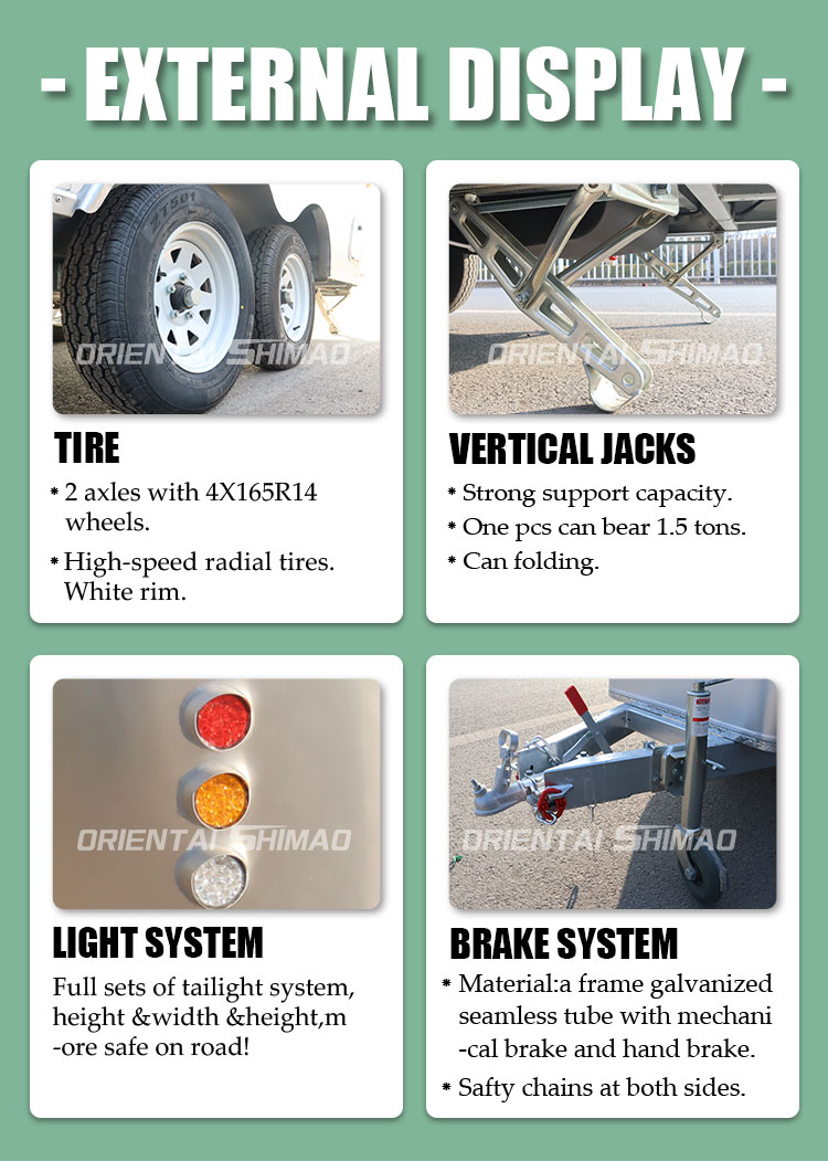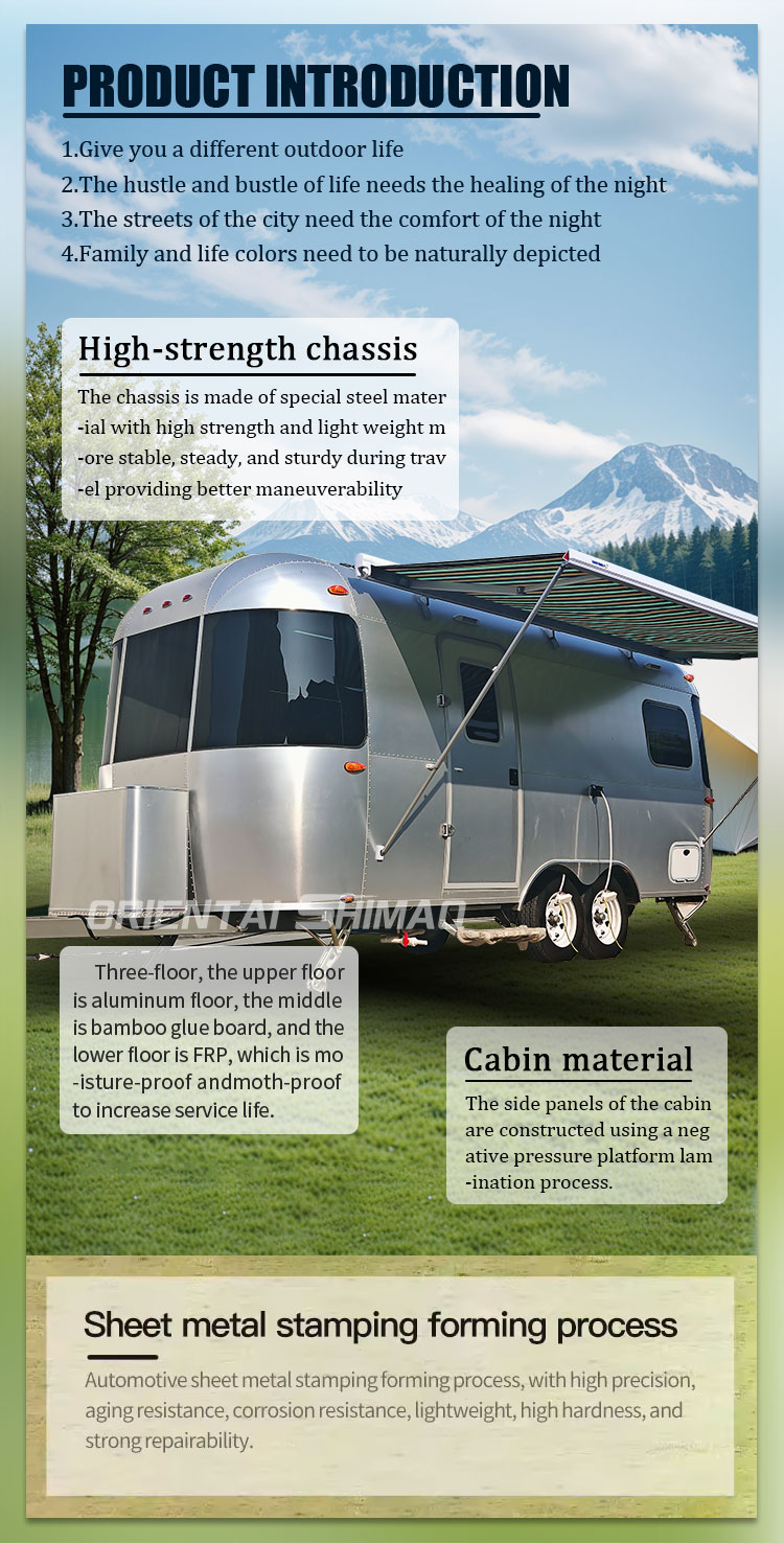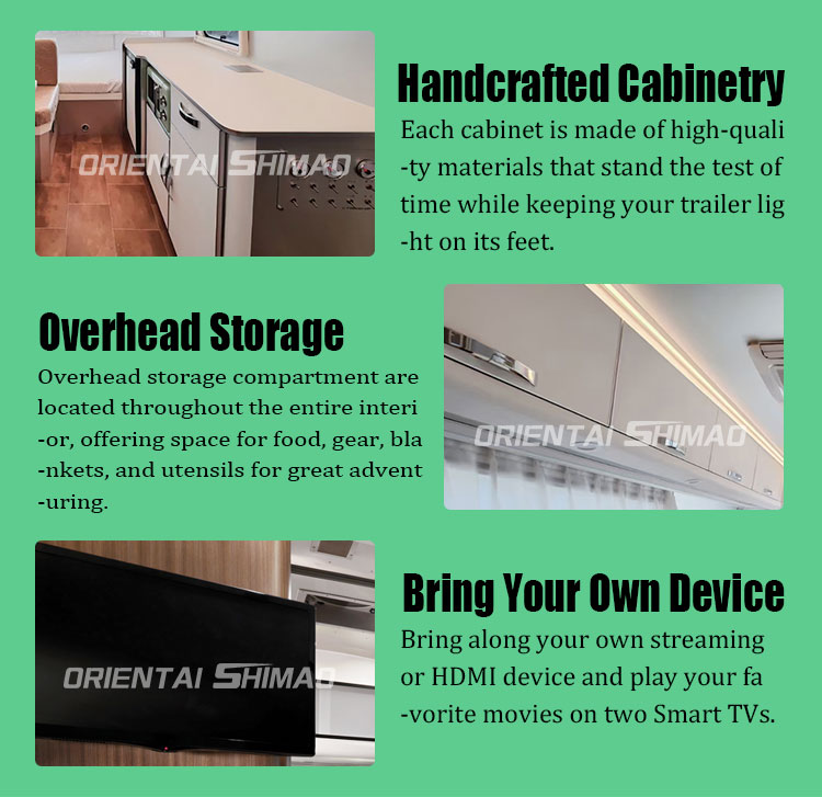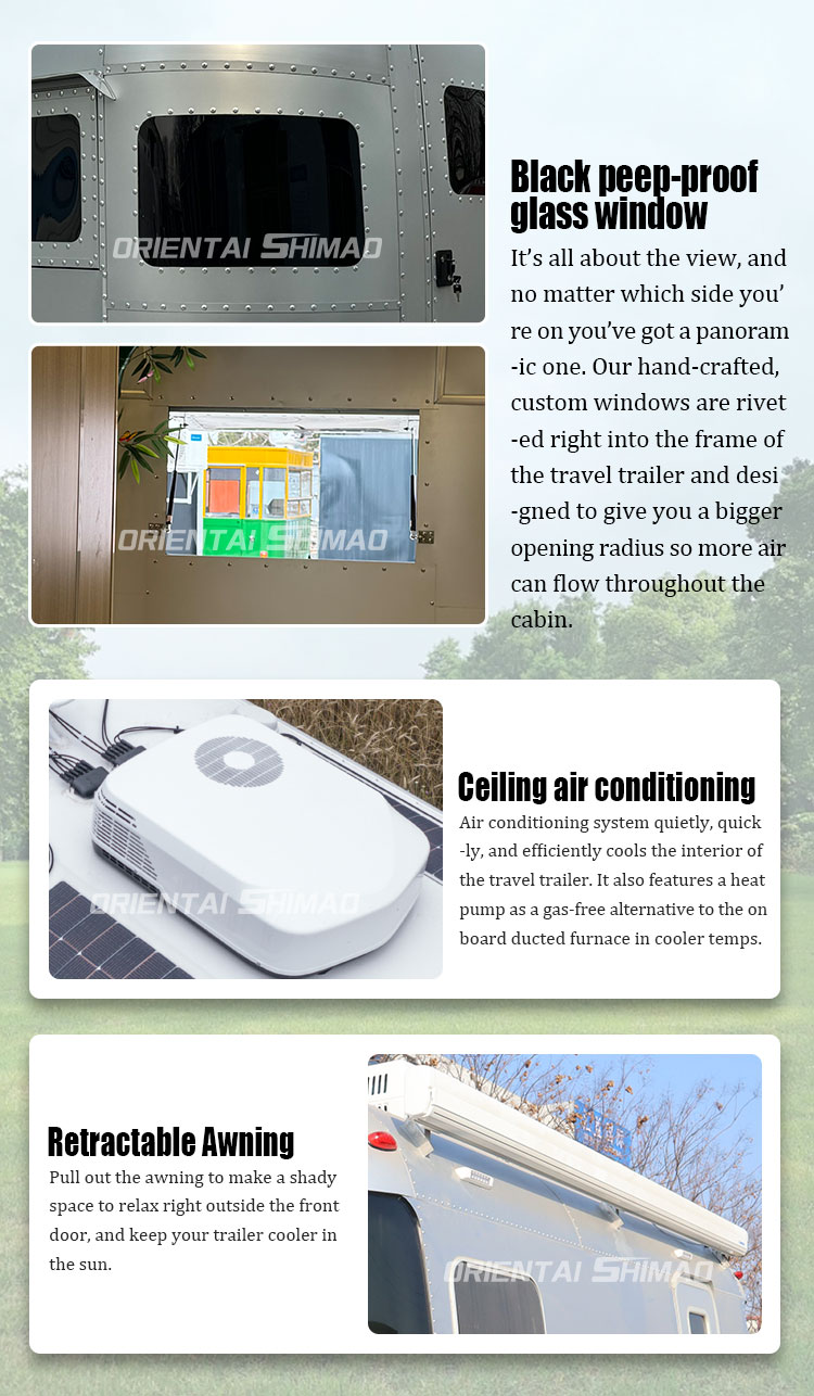 RV Trailer Truck có thân bọc hoàn toàn bằng nhôm, tùy chỉnh lấy bằng tay được làm nhẹ hơn và mạnh hơn so với các vật liệu khác. Sàn nhà của RV Trailer Home có ba lớp (sàn nhôm, bảng keo tre, sợi thủy tinh), có thể đạt được hiệu quả của chứng chống ẩm và chống côn trùng để đảm bảo tuổi thọ của nhà Trailer RV.