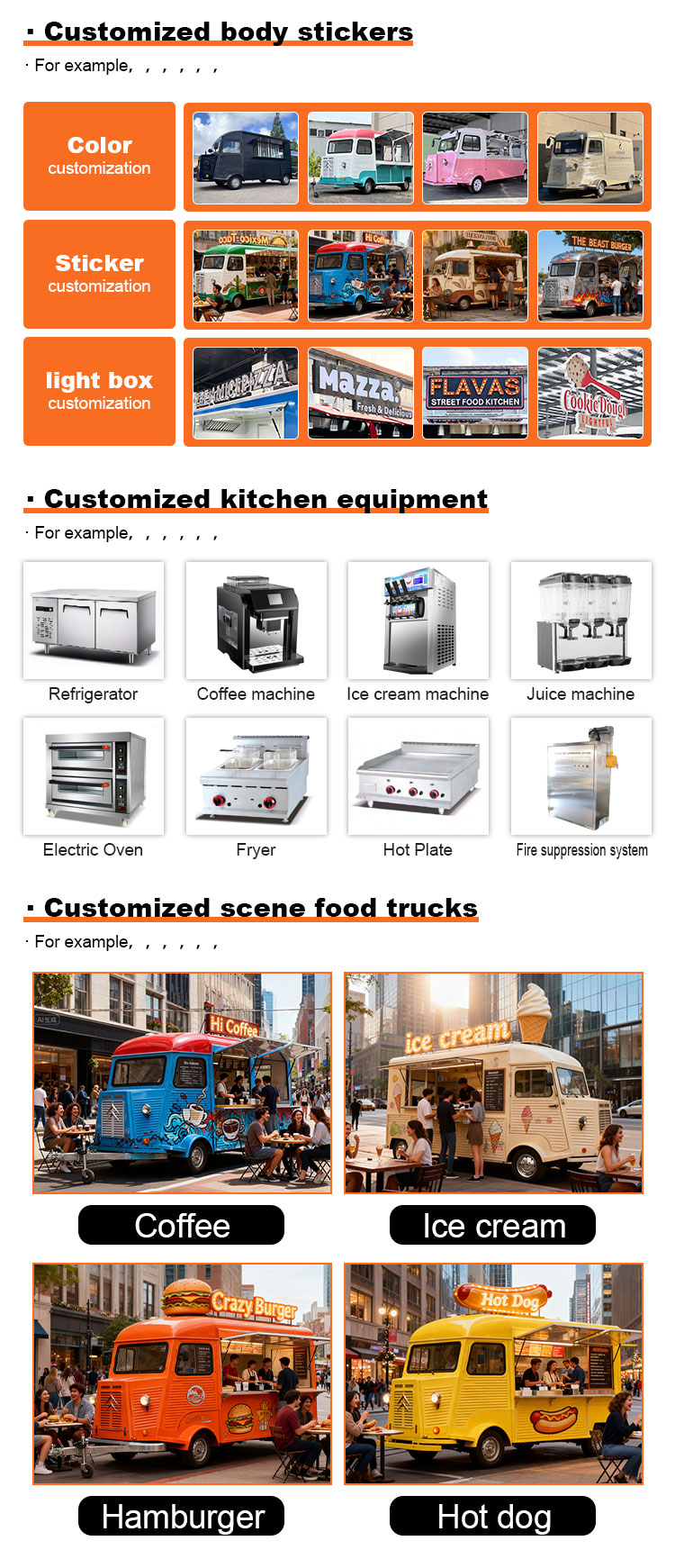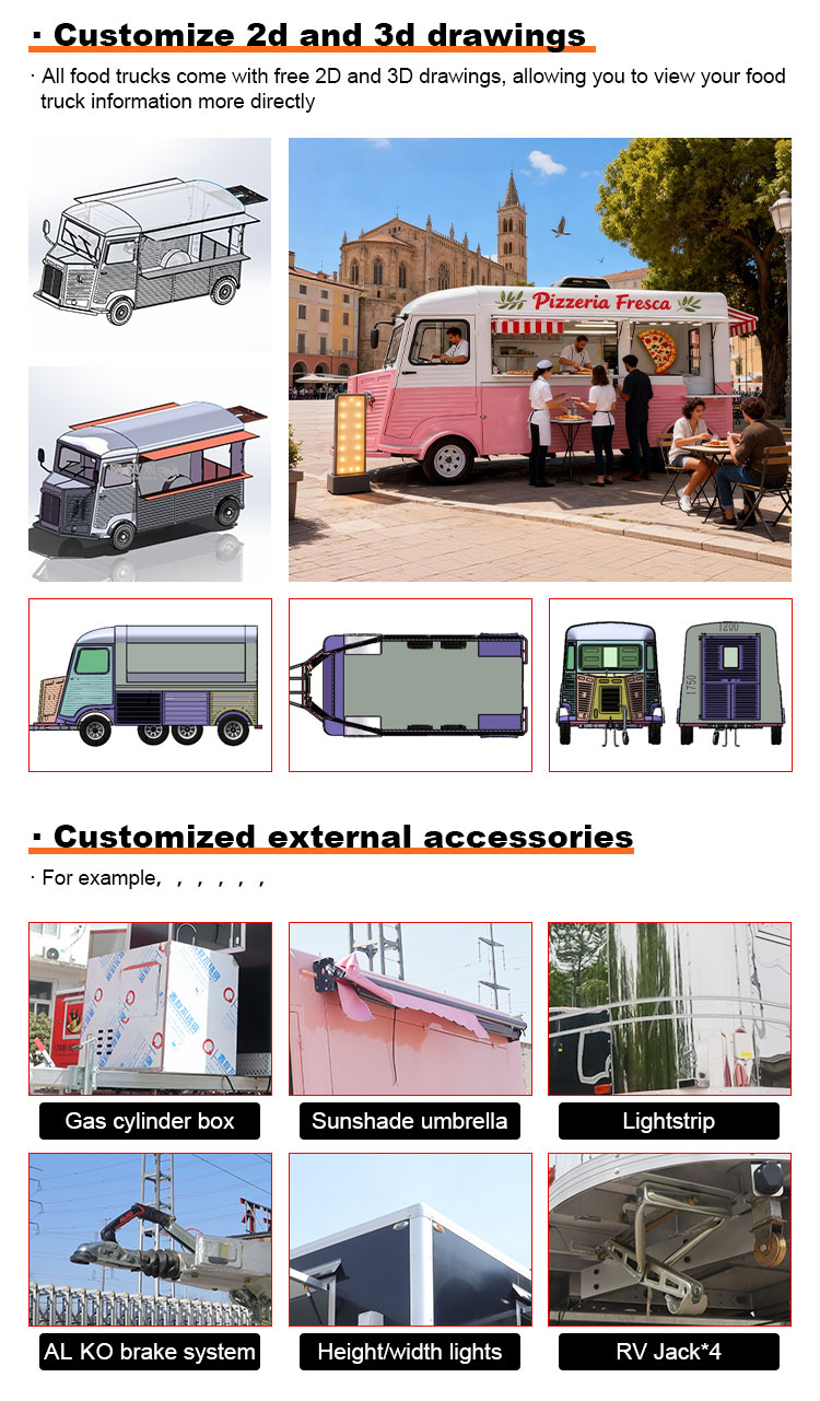 Kiểu dáng và kiểu dáng: Kiểu dáng và kiểu dáng bên ngoài của xe bán đồ ăn là yếu tố quan trọng để thu hút khách hàng. Nó có thể được tùy chỉnh theo hình ảnh thương hiệu của khách hàng, đặc điểm kinh doanh hoặc sở thích cá nhân, chẳng hạn như thiết kế hợp lý, phong cách cổ điển, đơn giản hiện đại, v.v.